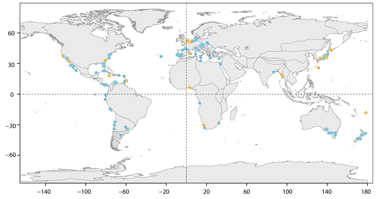 Figure 1. Occurrences of Otodus megalodon as recorded by the PBDB in 2016. This was the map that, to my knowledge, first visualised just how widespread megalodon was. Blue dots represent confirmed fossil occurrences while yellow dots mark more dubious records. Sourced from Figure 1 of Pimiento et al. (2016).