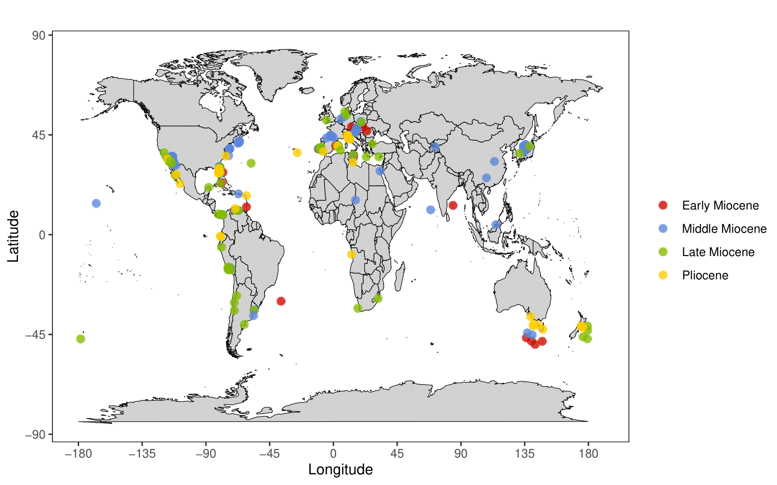 The most comprehensive study on megalodon’s geographic range was published in 2016, which conducted a meta-analysis on megalodon occurrence records from the Palaeobiology Database (PBDB); showing how its global area coverage and occupancy changed over its temporal range (Pimiento et al. 2016). Although the main purpose of this study was to investigate possible extinction mechanisms to explain these patterns, it also showcased that megalodon’s cosmopolitan distribution was captured by the PBDB, occurring along mostly coastal habitats (Figure 1; Pimiento et al. 2016).